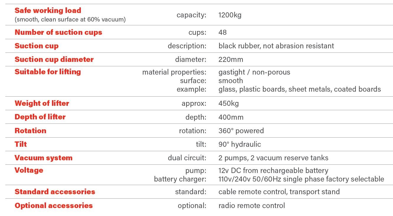 This specialist lifter is perfect for handling heavy and curved glass weighing up to 1200kg.