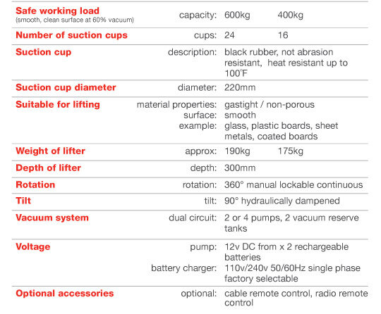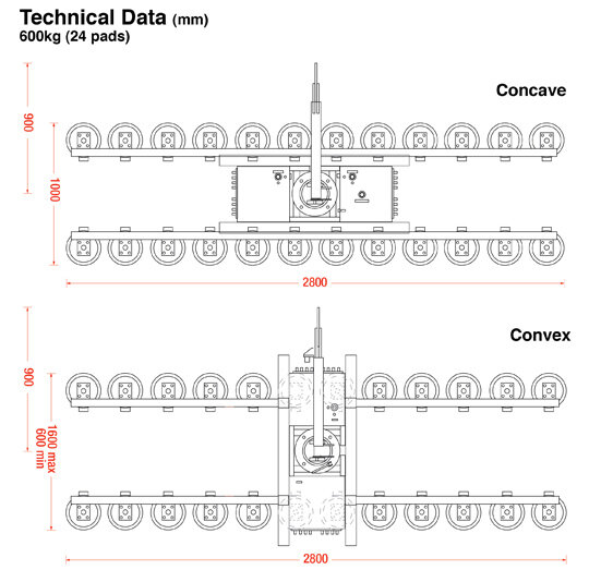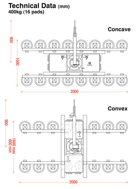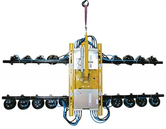 The DSZ2-12V encompasses 16 or 24 pads mounted onto flexible swivel arms that mould themselves to a load. This specialist lifter can be configured two ways to suit convex or concave glass loads weighing up to 400kg or 600kg.