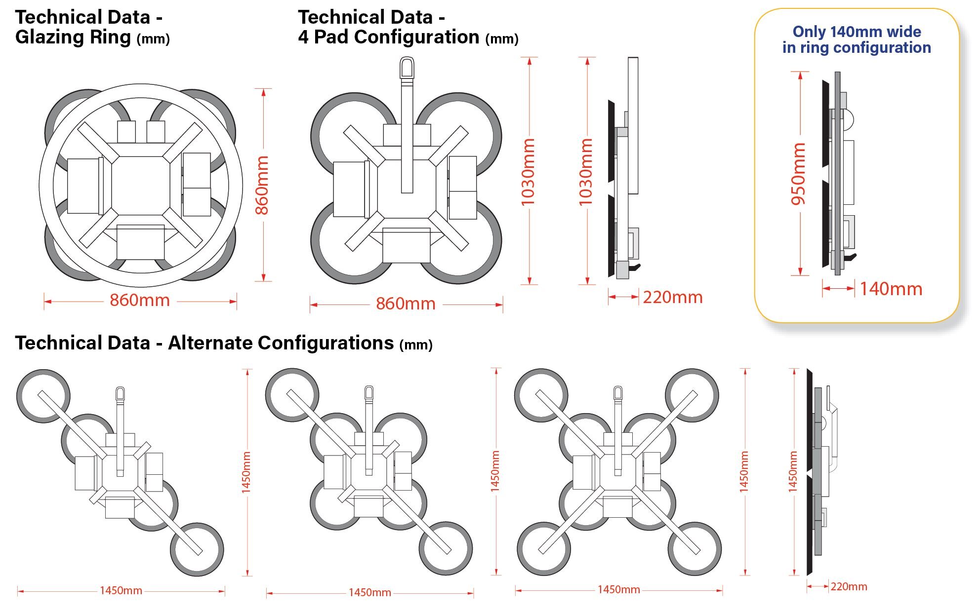 - 8, 6 or 4 x 400mm diameter suction cups