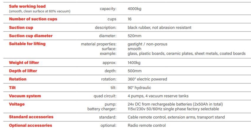 The Hydraulica 4000 boasts a vacuum lifting capacity of 4000kg making it ideal for lifting large panes of glass, which have become more common in modern construction projects. With a maximum capacity of 4000kg and featuring 360° battery powered rotation with 90° hydraulic tilt, this vacuum lifter is ideal when maneuvering large, heavy loads.