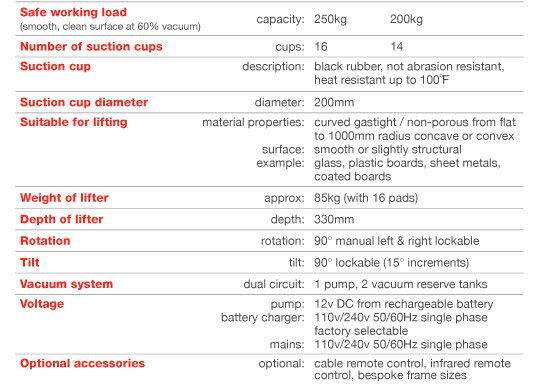- On-board maintenance-free vacuum pump powered by 12v battery with integral charger or 110v/240v mains