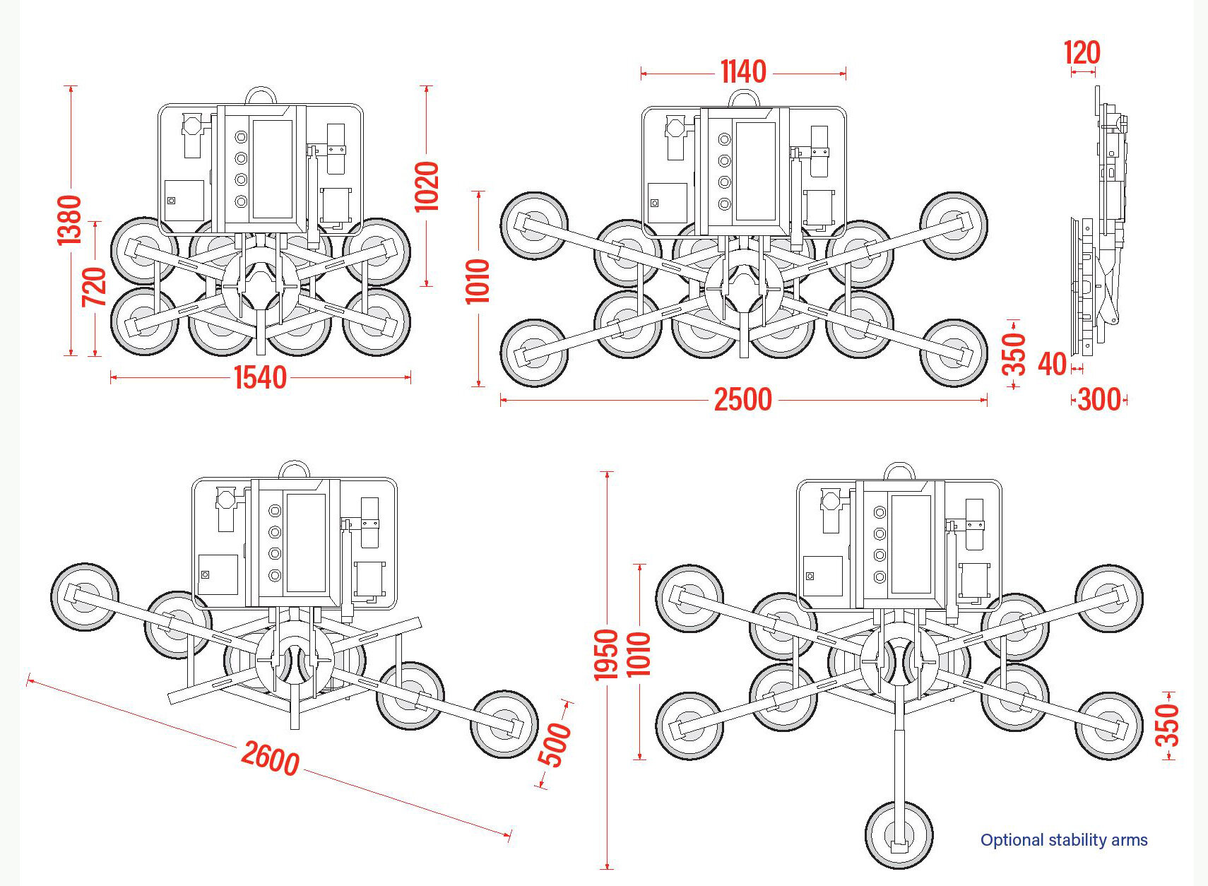 A maximum of 12 suction pads and four arm extensions can be added to this versatile lifter, with the ability to isolate each pad. The Kombi 7441-Quadra also offers a stepless 90° hydraulic powered tilt function and manual 200° rotation for easy handling and installation of glazed units with an optional radio remote control.