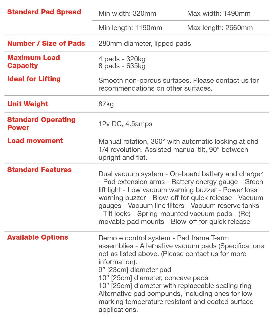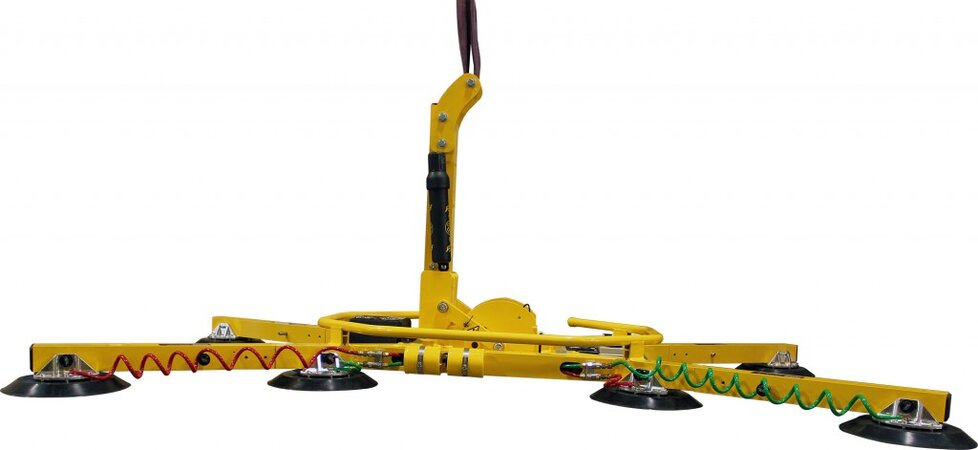 The MRTA811 vacuum lifter now includes innovative Intelli-Grip technology as standard. Designed to lift loads 320kg in a 4 pad configuration and 635kg in an 8 pad configuration, the MRTA811 Quadra-Tilt window sucker is ideal for lifting smooth, non-porous materials such as glass, sheet metal and composite panels. This vacuum lifter’s capacity and versatility makes it ideal for a range of on-site and in-house projects.