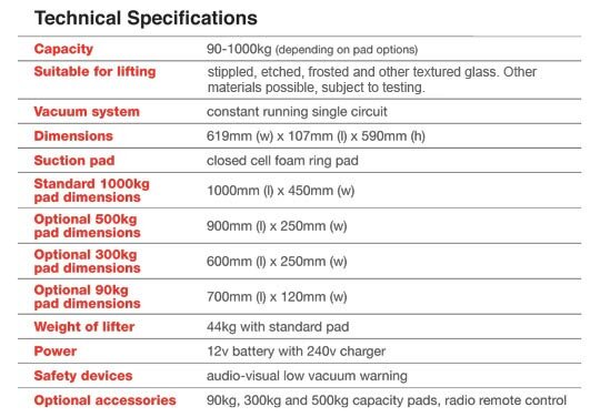 It features a constant running vacuum pump and closed cell foam ring which moulds to irregular surfaces. The TS1000 can lift up to 1000kg (horizontal lift) or 600kg (vertical lift)