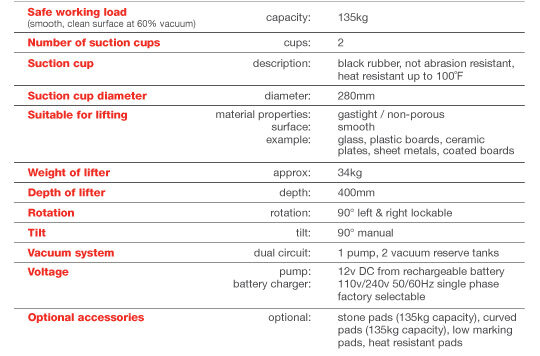 The MRT2 lifter makes glass handling safe and simple using dual circuit vacuum system technology and two suction cups to carry out your vacuum lift and transport loads of up to 135kg.