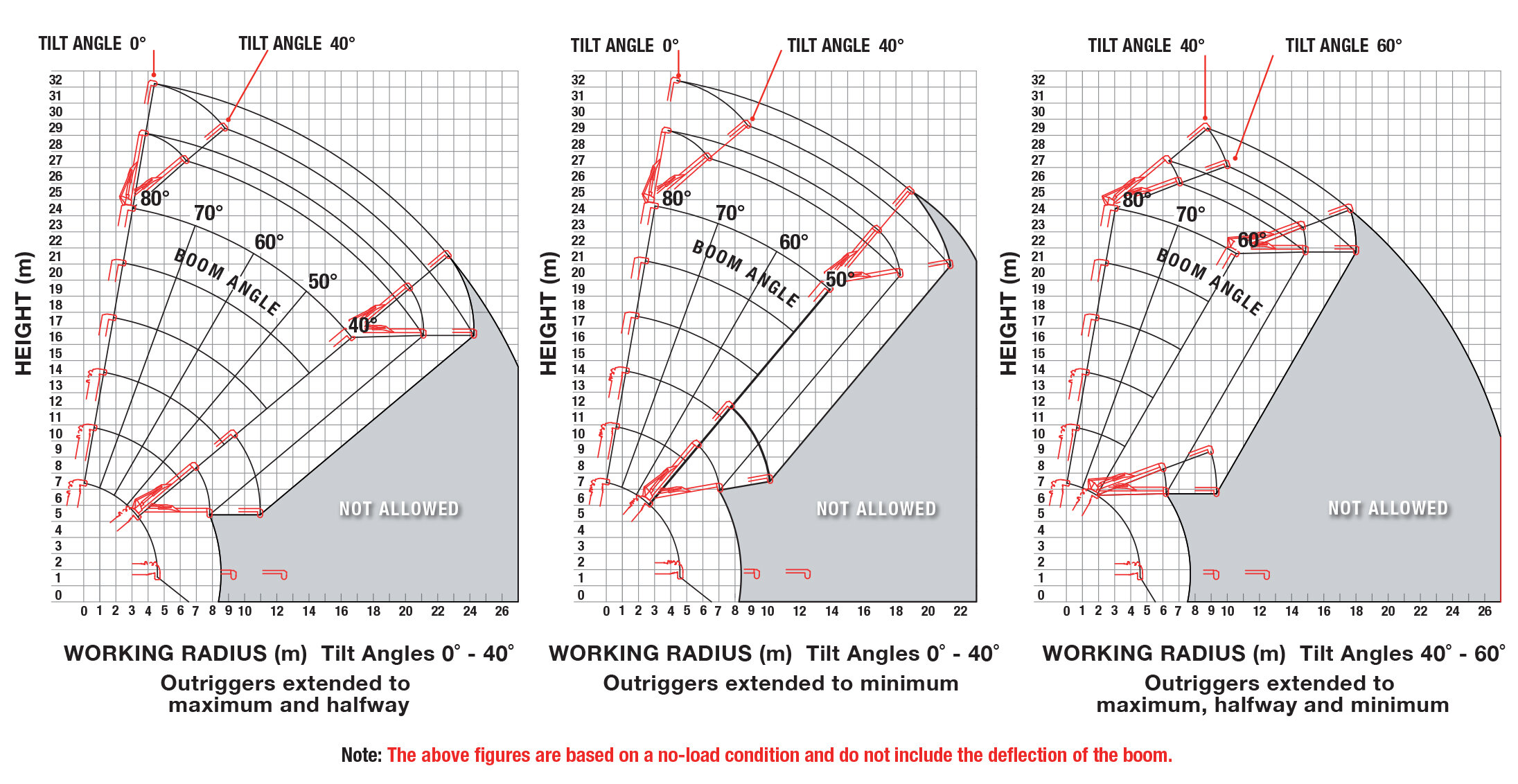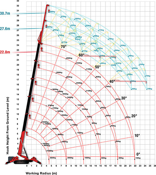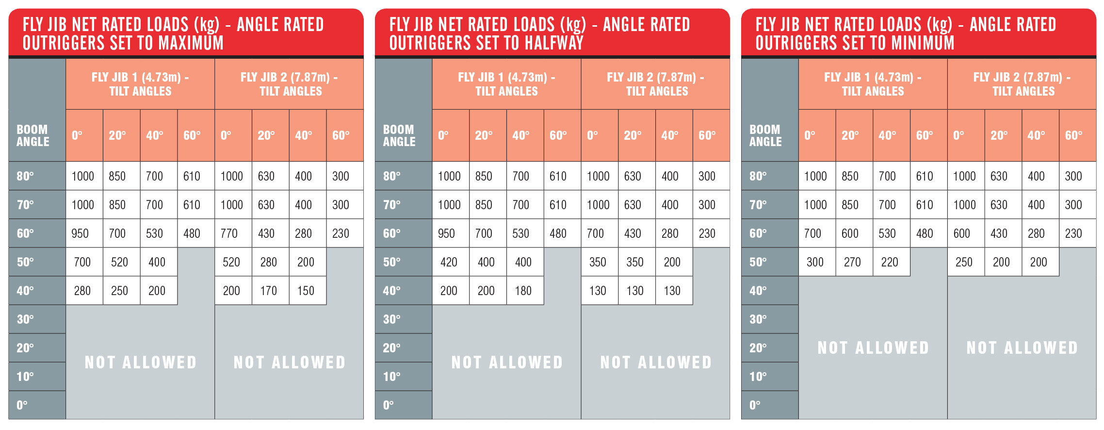 This hydraulic fly jib has a further advantage as it can be adjusted while the crane boom is in the air, rather than it being manually set when the boom is down. A rated load chart and working radius diagram for the UNIC URW-1006 and hydraulic fly jib are below.