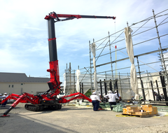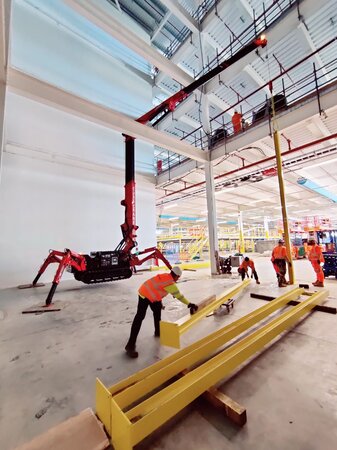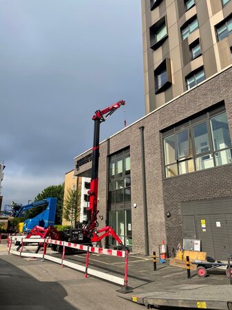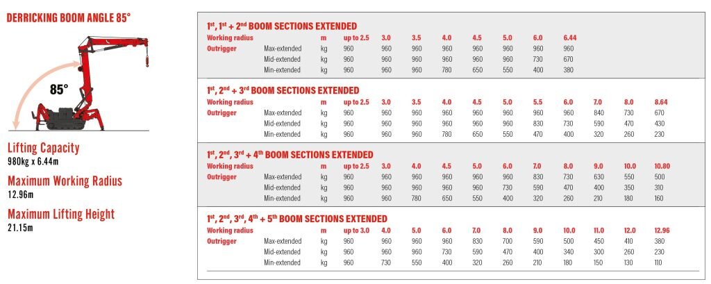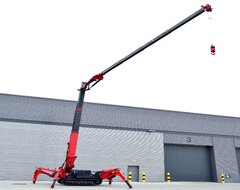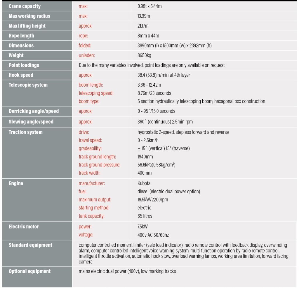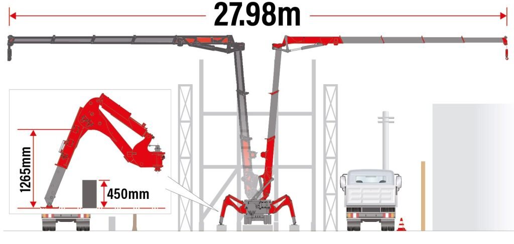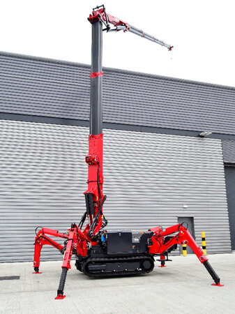 Featuring nearly a tonne of lifting capacity, this mini machine also benefits from a lifting height of 21.1 metres and a horizontal reach giving a maximum working radius of 13.99m. At just 1.5m wide, this compact crane can gain access through a standard double doorway and can easily move around corners thanks to its ability to reposition the boom whilst travelling to its install location.
