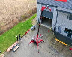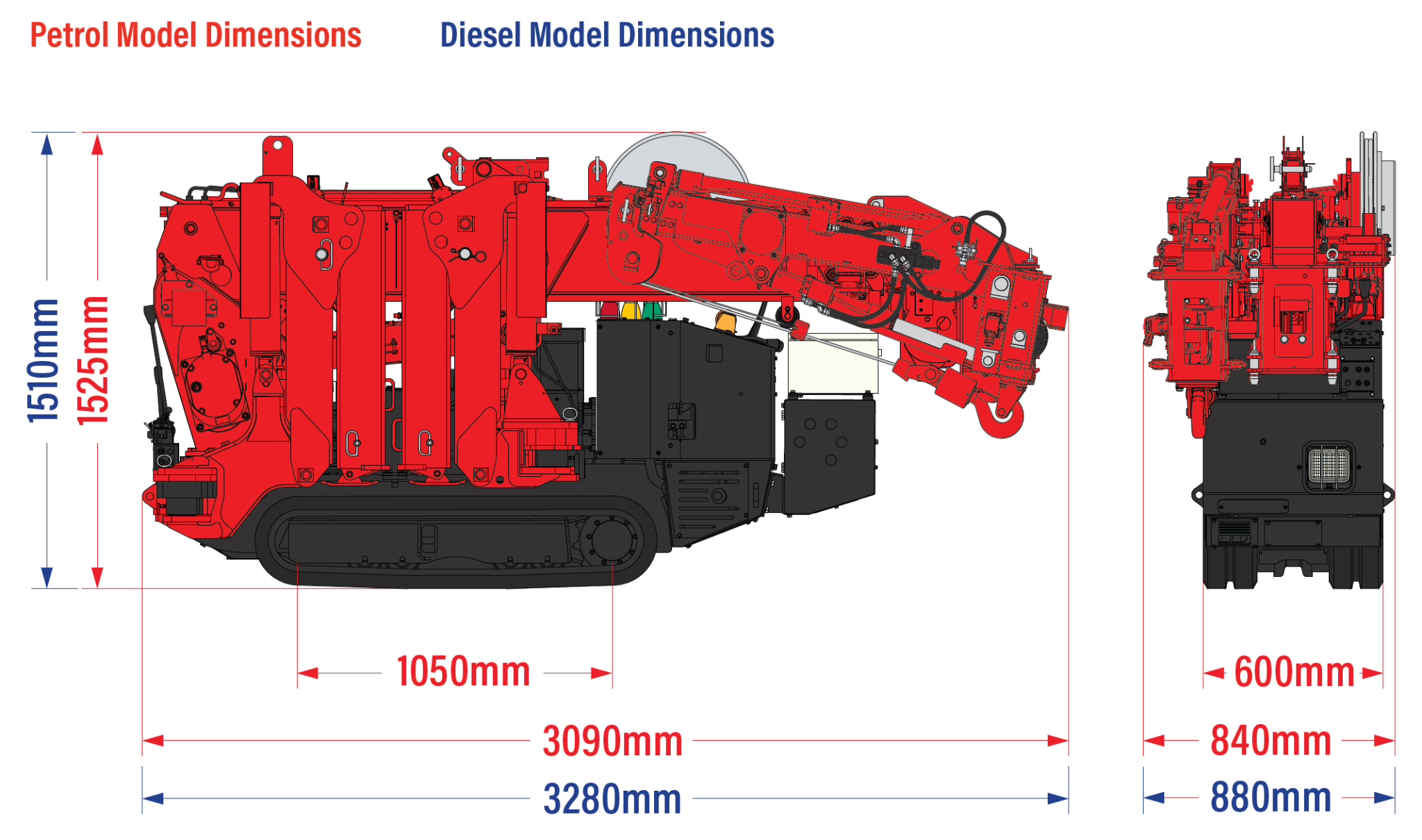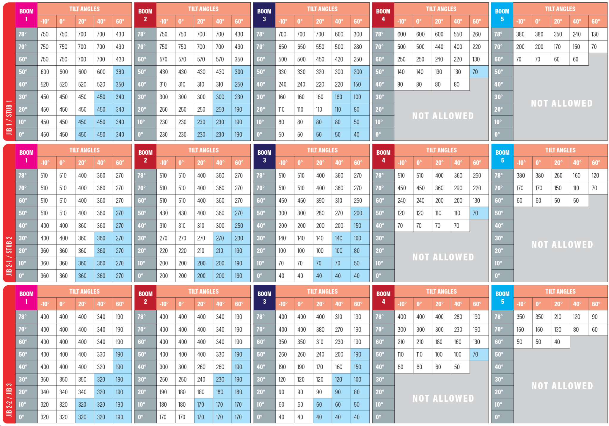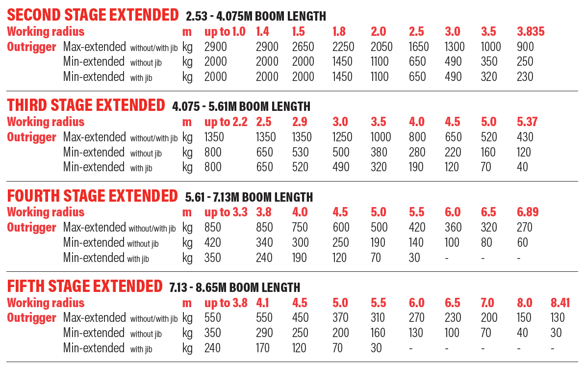 The new telescoping luffing jib offers a maximum capacity of 750kg, jib extension range of 1.2m to 2.8m (800mm manual extension & 800mm of hydraulic extension). This attachment also features a luffing range of -10° to 60° offsets while also increasing the max lifting height of the crane to 12.5m and an impressive working radius of 9.1m.
