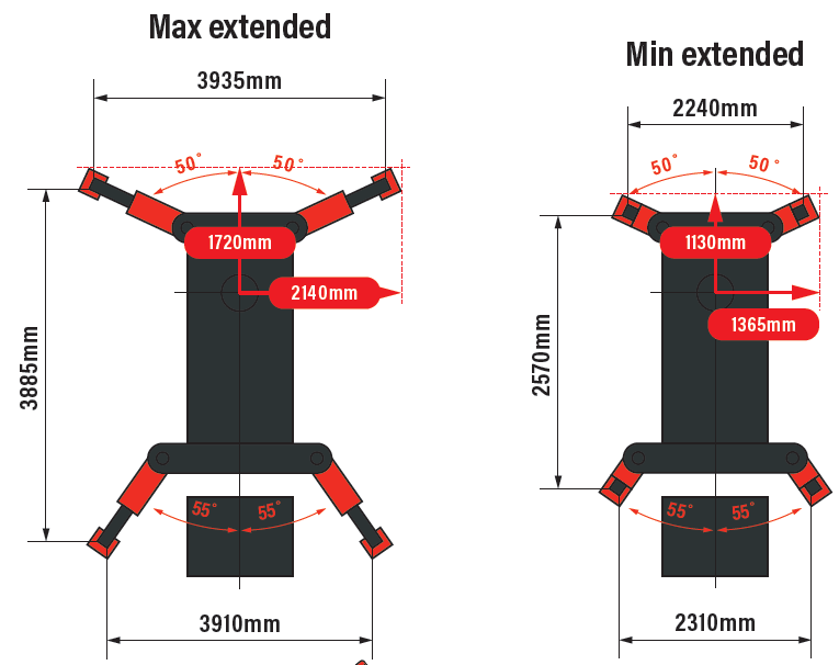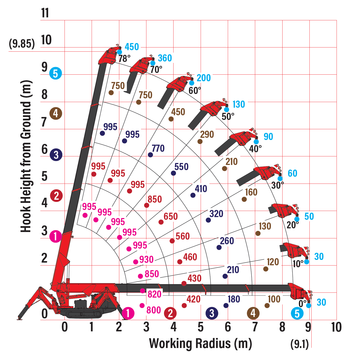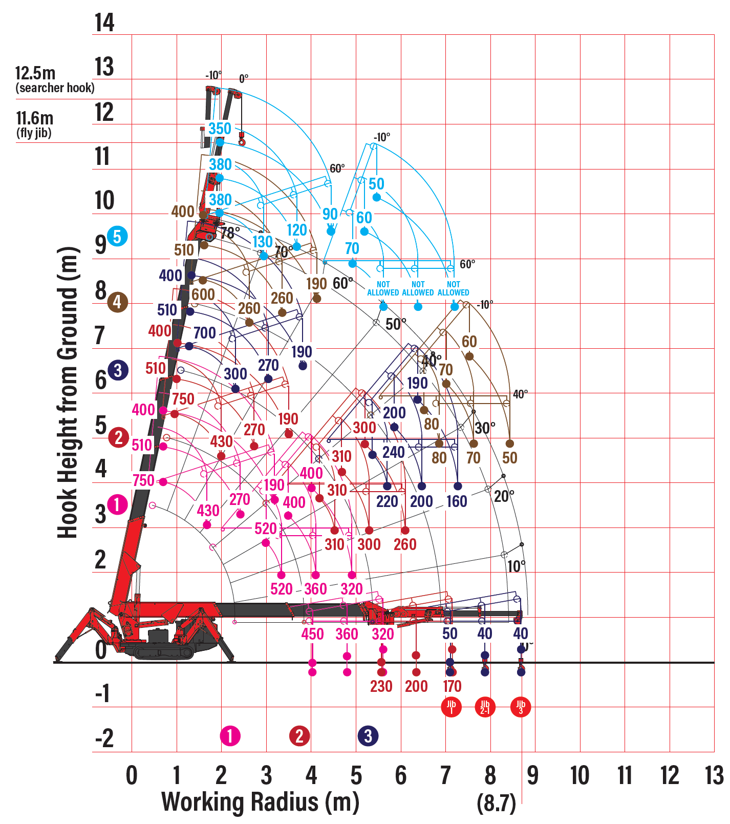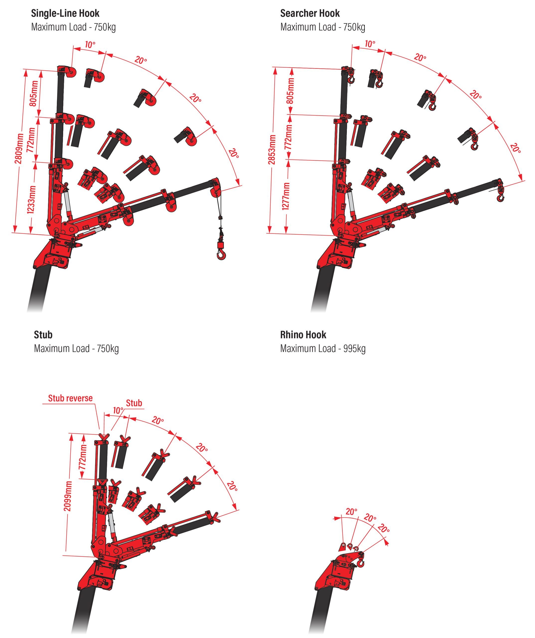 - Max working radius 8.41m, 11.7m with searcher and single-line hooks