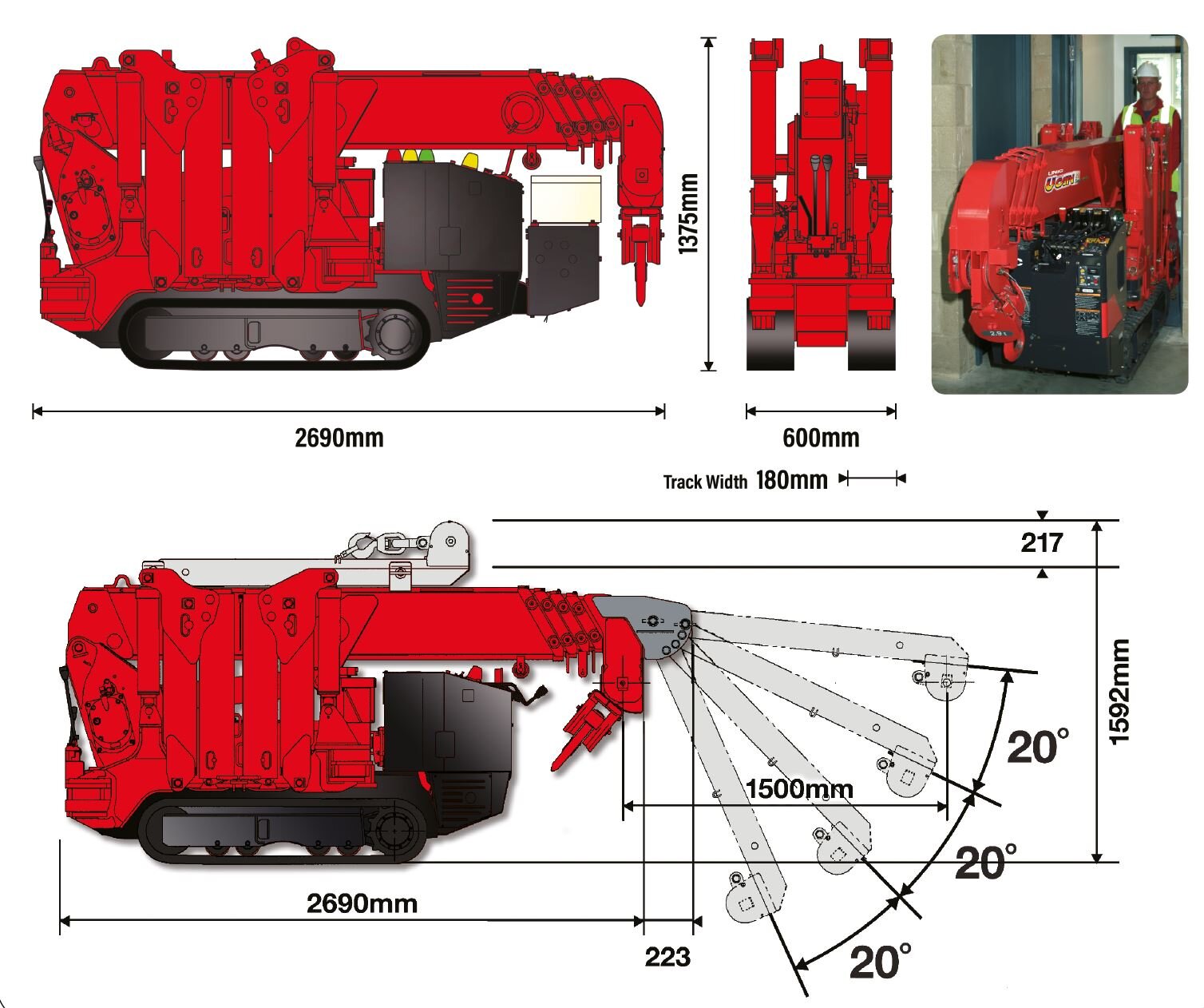 With a width of just 0.6m, the URW-295 -3 can access through a standard door frame yet comes with a heavy lifting capacity of 2.9 tonnes. The 8.65m boom provides a maximum lifting height of 8.8m, whilst an optional fly jib gives a further 1500mm reach where required.