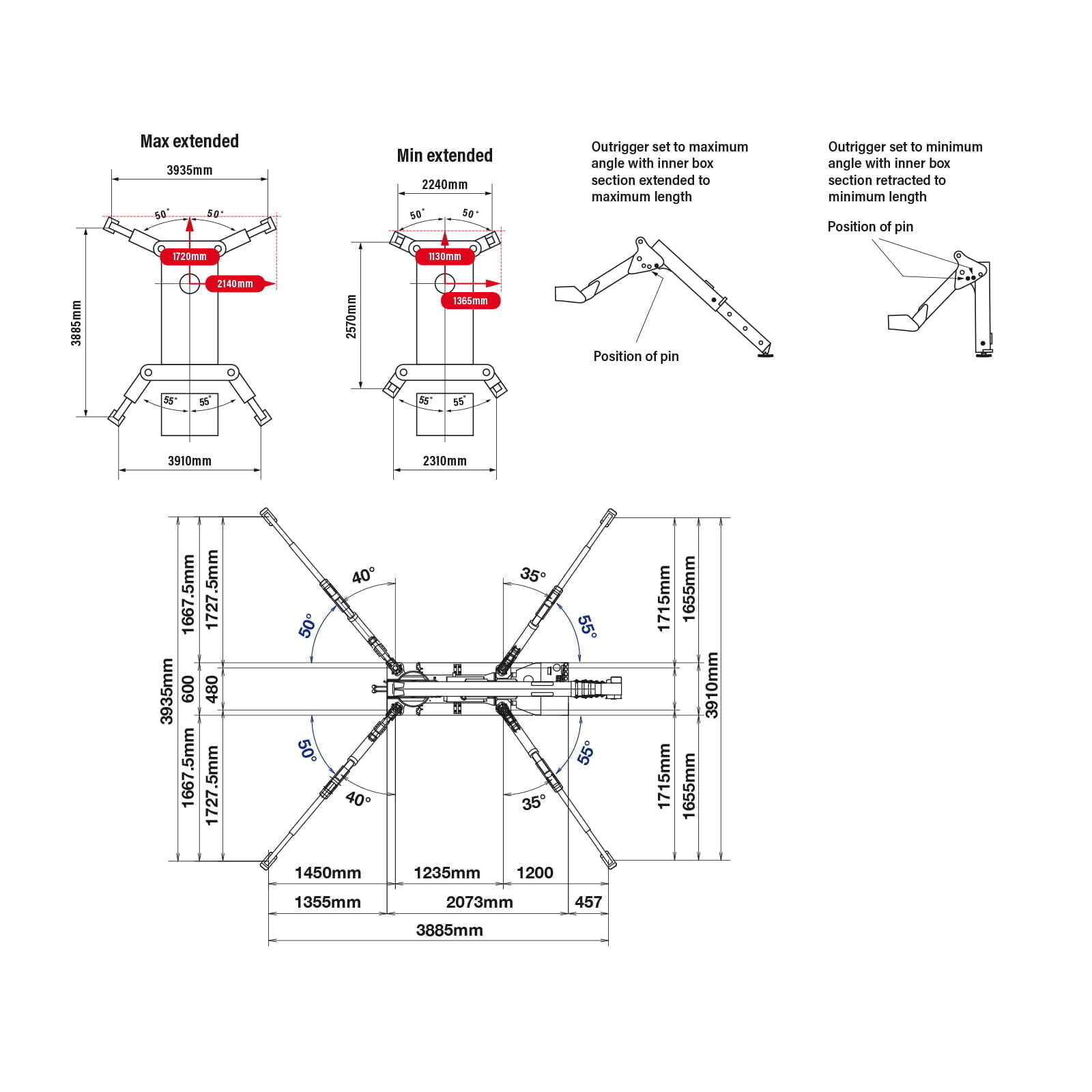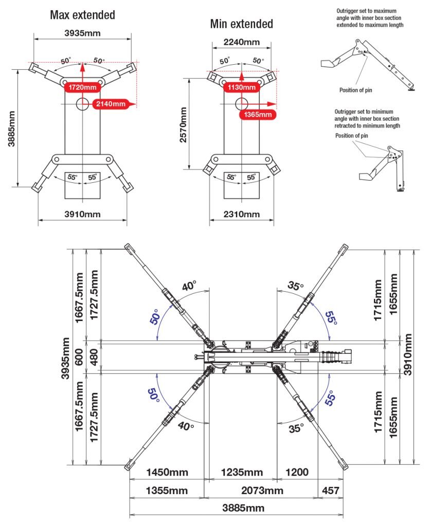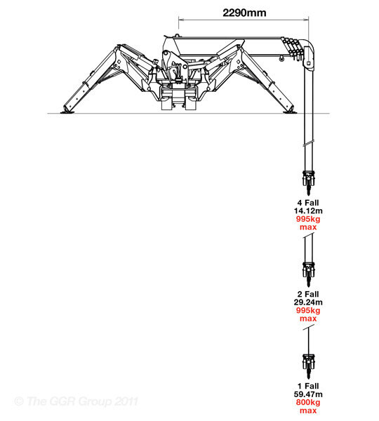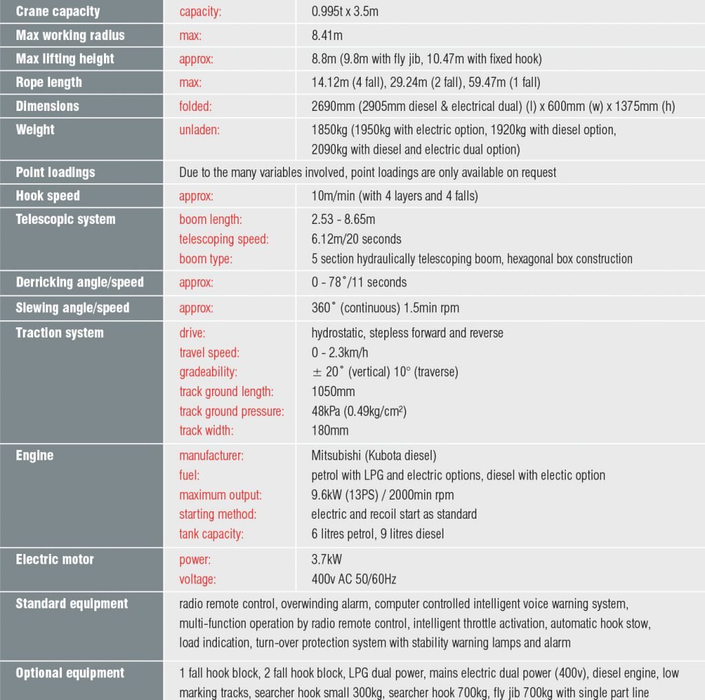 - Max lifting height 8.8m (9.8m with fly jib, 10.47m with searcher hook)