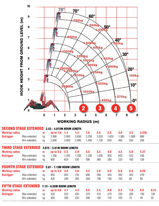 - Max lifting height 8.8m (9.8m with fly jib, 10.47 with fixed hook)