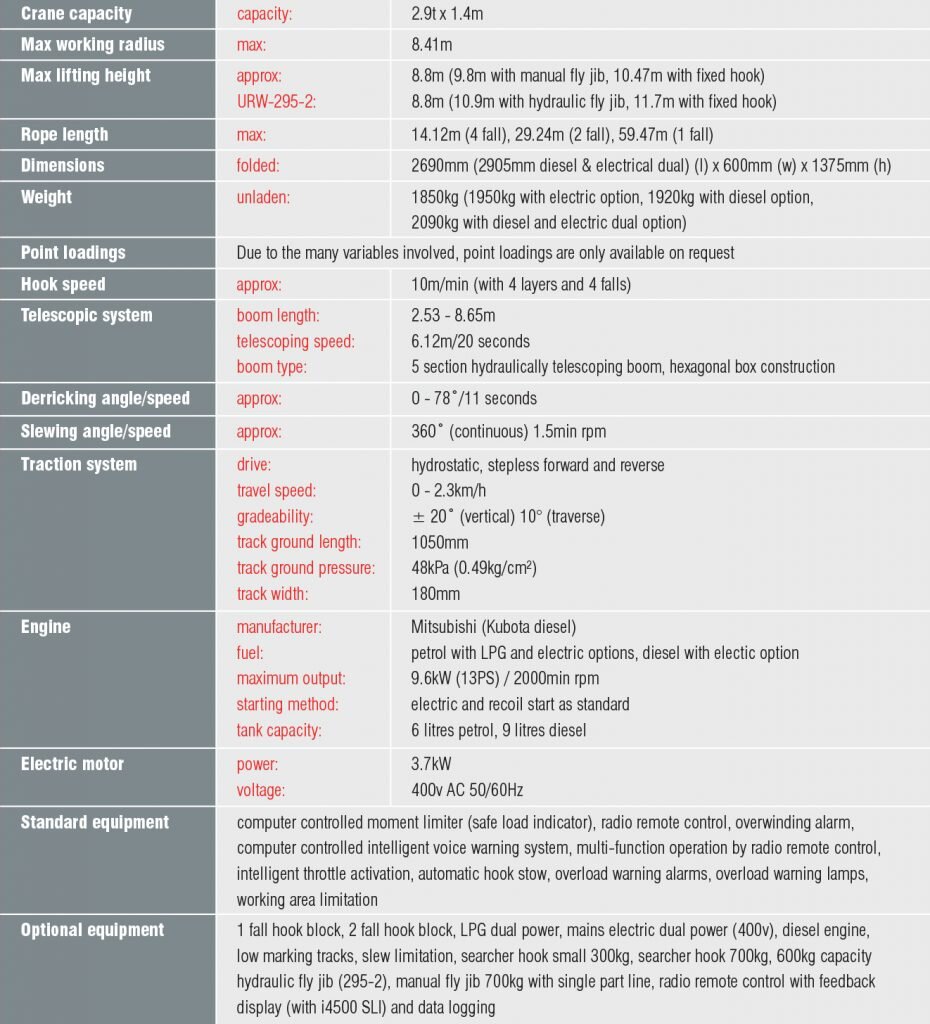 Featuring Lift-Smart Advanced Safety System, the URW-295 includes a safe load indicator to prevent the crane operating outside of its safe working envelope. The UNIC URW-295 has been used for a broad variety of applications, from construction work and plant maintenance, to steel erection, cladding installation, railway maintenance and more.